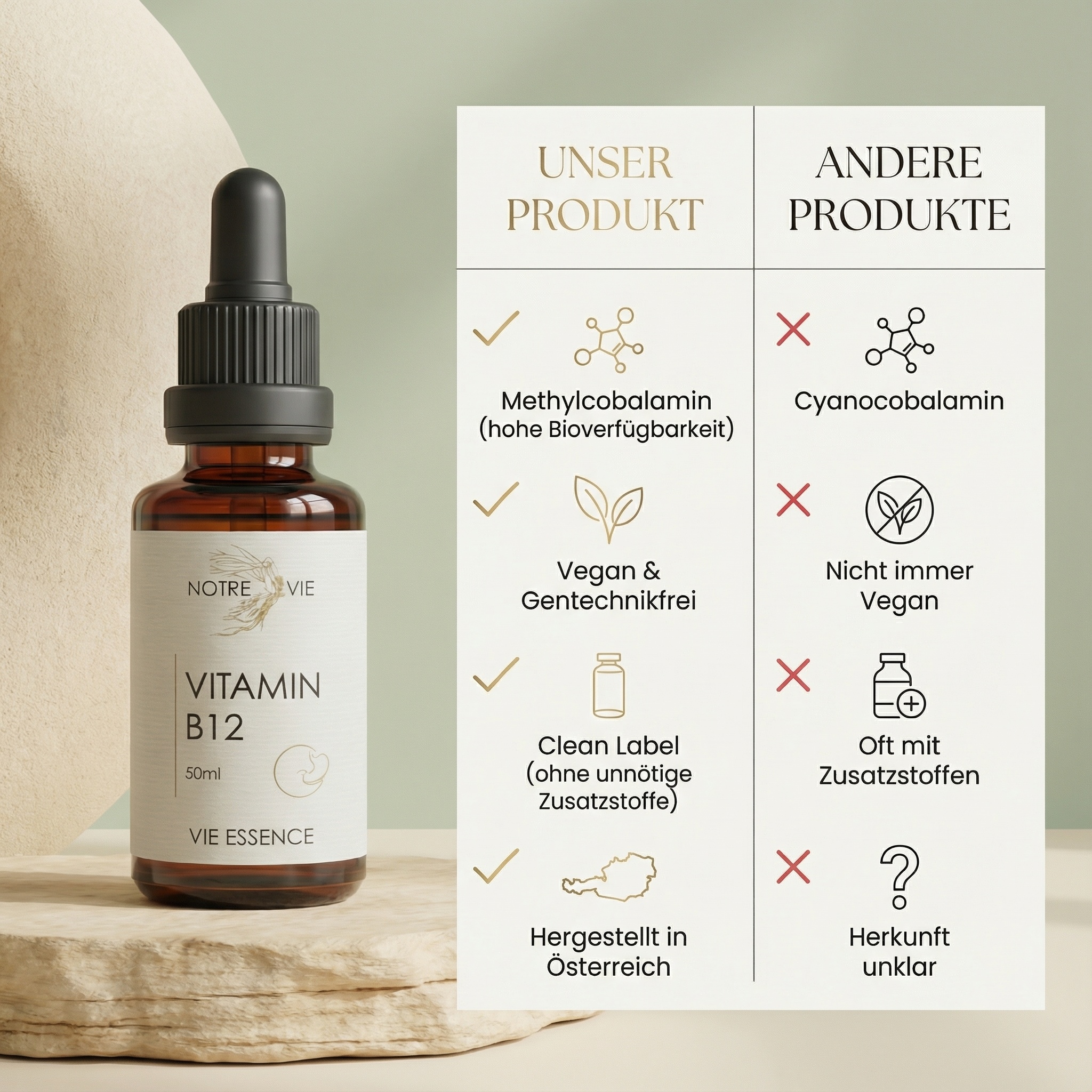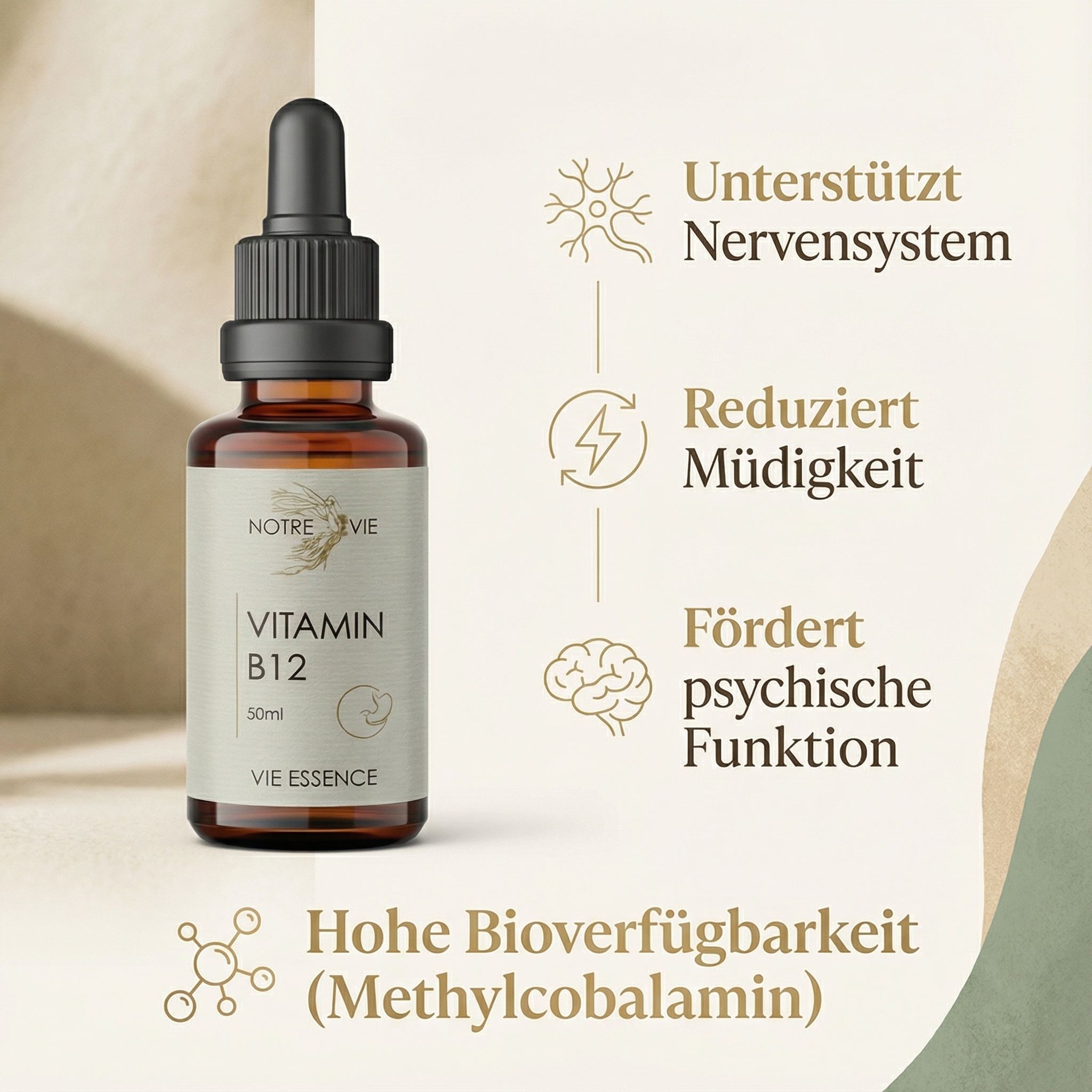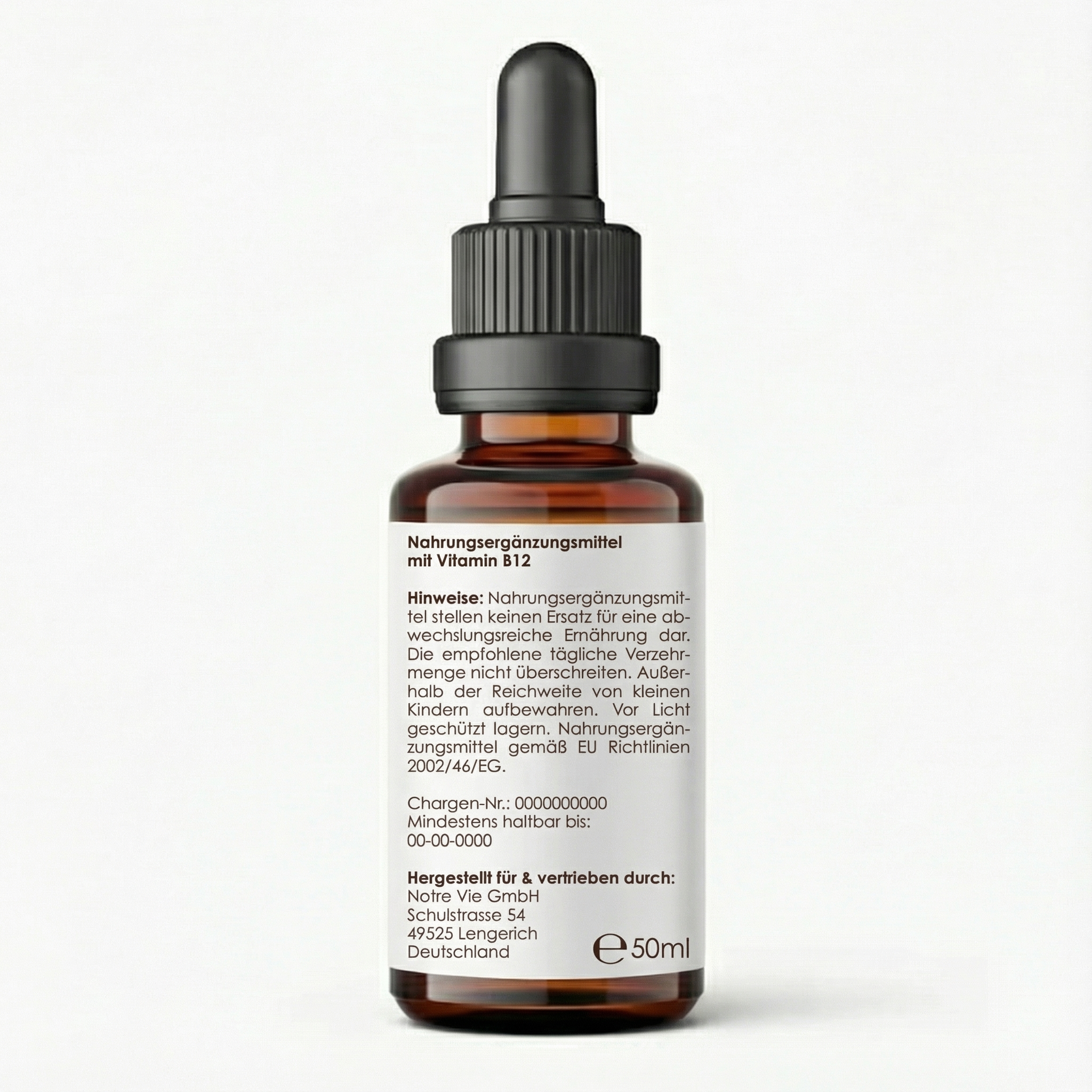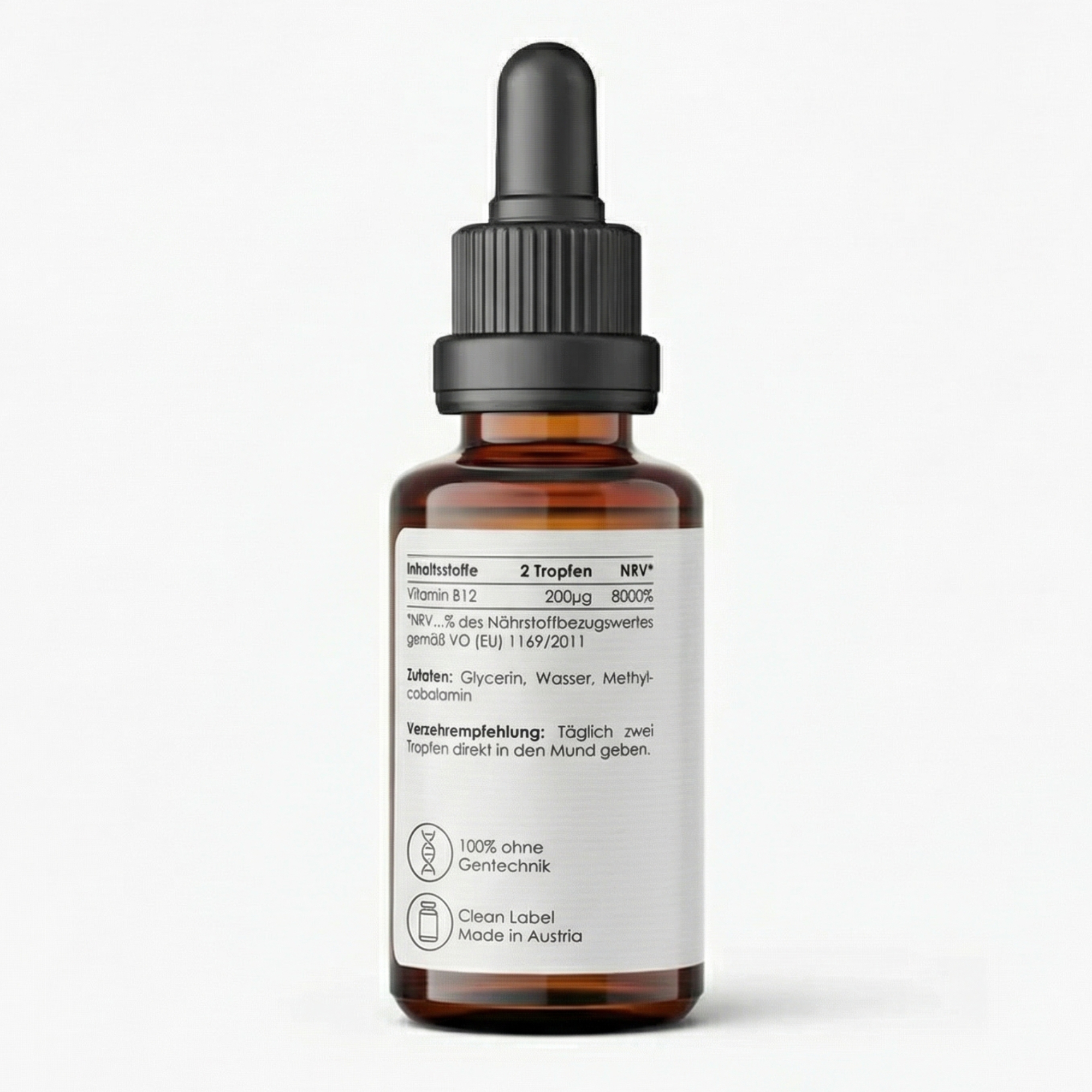 Our Vitamin B12 contains high-dose Methylcobalamin – the natural and bioactive form of Vitamin B12 – in a convenient liquid form. Unlike tablets, the drops can be absorbed directly via the oral mucosa, supporting optimal bioavailability.