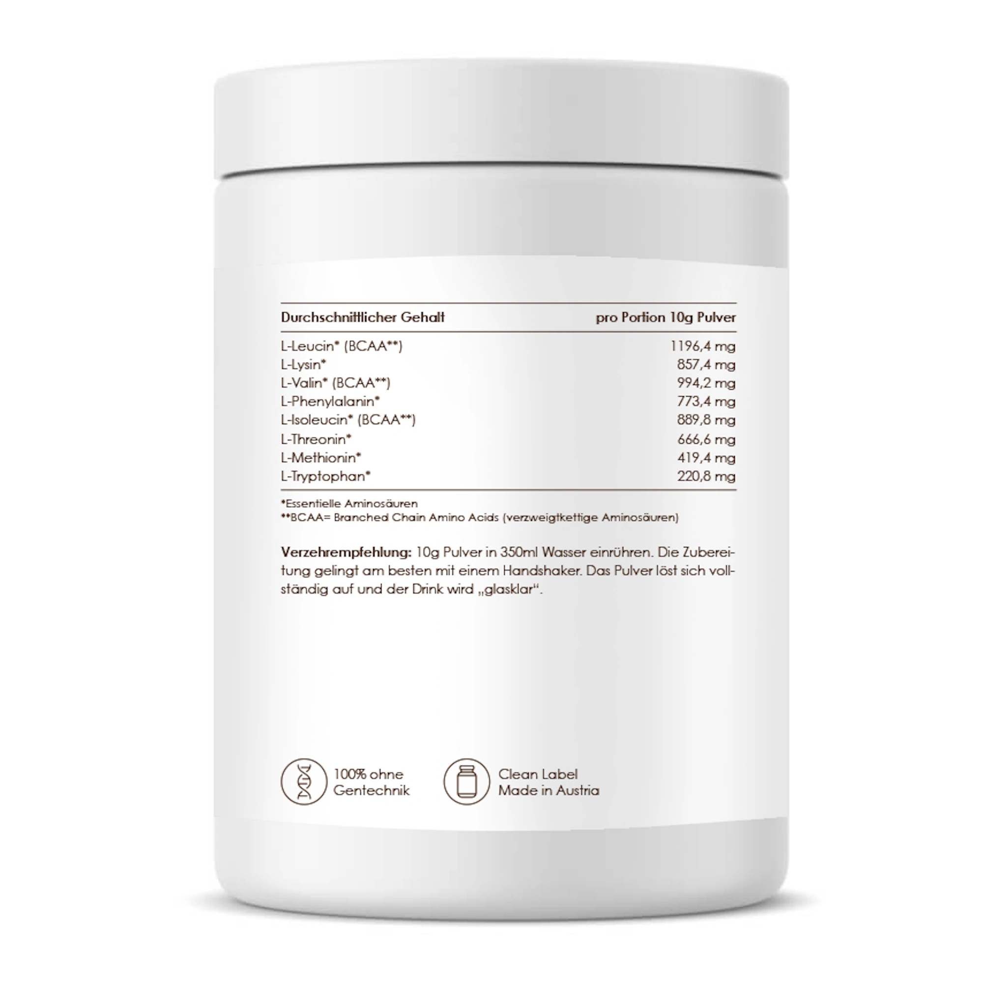 The composition is based on the "Master Amino Pattern". This means the ratio of amino acids is perfectly tailored to the human organism, allowing for extremely efficient use in protein synthesis. Ideal for muscle building, maintenance, and recovery – without burdening the digestive tract.